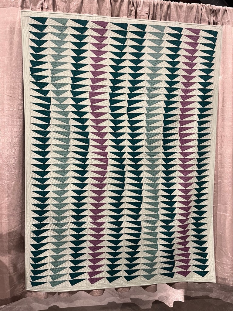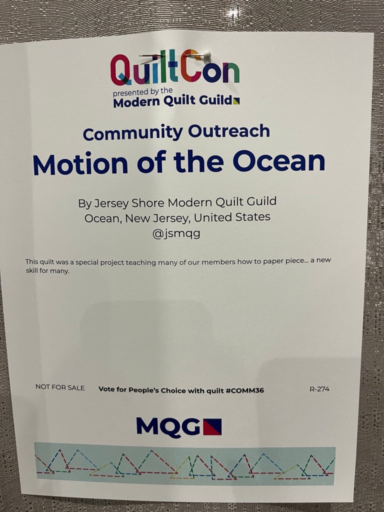 Our quilt entry for the Modern Quilt Guilds Community Outreach Challenge is home from QuiltCon in Raleigh NC. “Motion of the Ocean” is what we call her and her next journey will be to a local charitable organization for a fundraiser. We’re in the process of finding one right now.