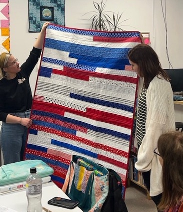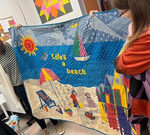 Another example of the work we do in our community, Helen was contacted by a local high school looking for assistance in taking their artwork and creating a quilt. She assembled them, quilted it and Eileen bound the edges and added a hanging sleeve for display. I’d say she nailed it!