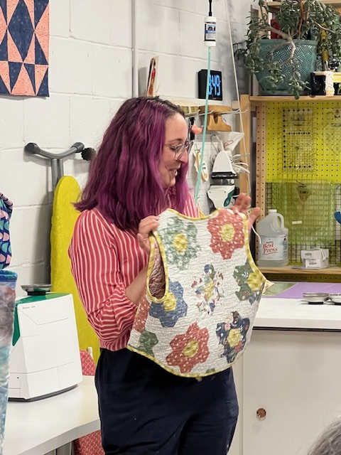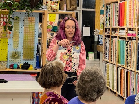Brooke schooling the crowd on her watermelon themed log cabin block for the July block lotto