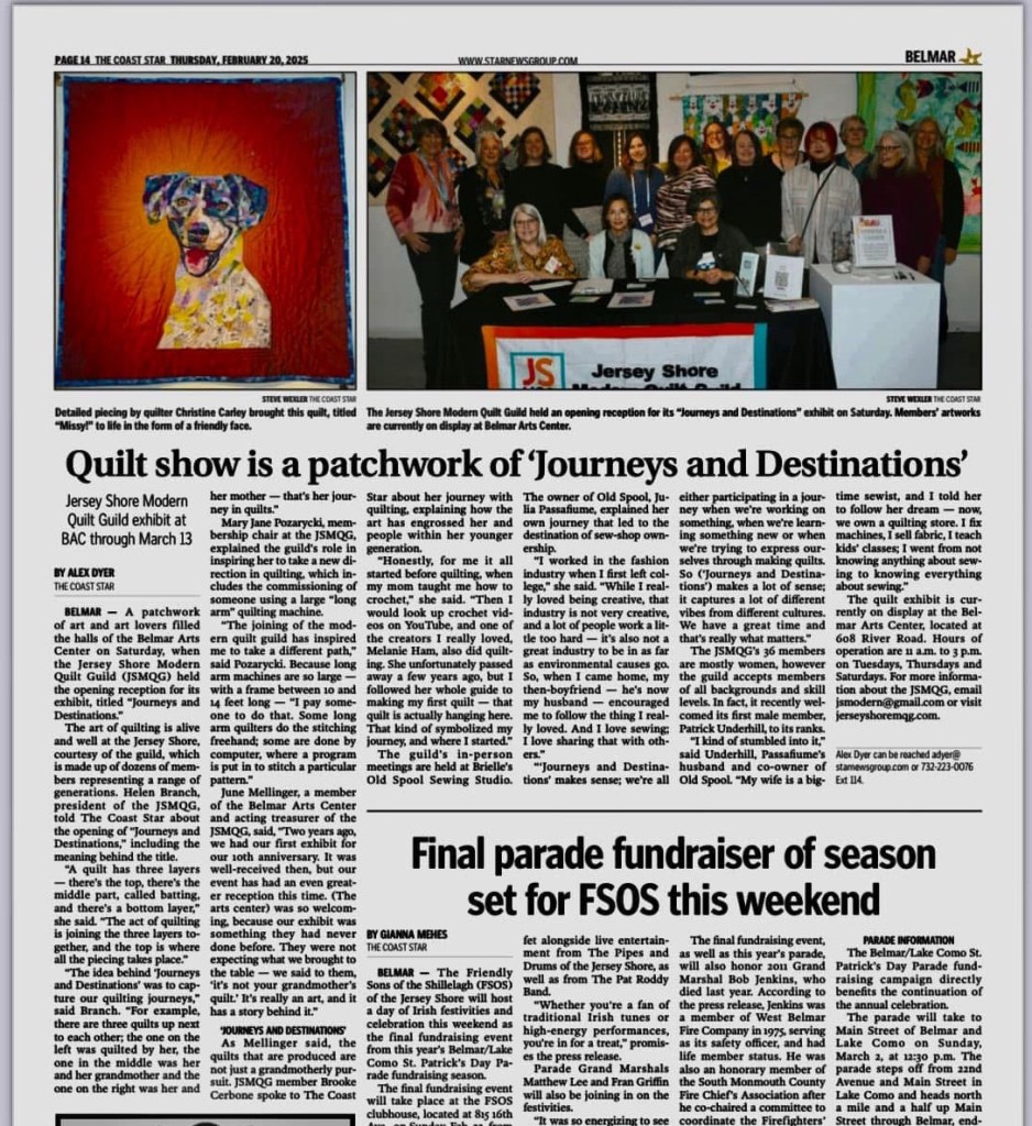 February was a whirlwind of a month for us here at the Jersey Shore MQG. Our second quilt exhibit at the Belmar Arts Center was another great success, including a well attended, wonderful Opening Reception and an entire month of visitors at the Arts Center.