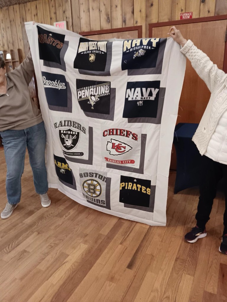 The interruption was a welcome break for this class of ladies and they got to hear Kathy speak about our guild and the relationship we have with Team Shamrock. Kathy went on to tell them about how we have presented the last three local smart home recipients with quilts to welcome them into their new homes that the Tunnel to Towers Foundation has made possible. There was quite a bit of oohing and aahing when the group saw the beautiful Irish Chain quilt, crafted by our members, that will be part of the gift auction this year on October 10th at Bar A. It really turned out incredible! Needless to say everyone loved it and there were many questions about the guild and our meetings. I expect we may see some new faces at our next meeting. Interestingly enough, one woman said she was at the event last year and her partner won the quilt!! Yay! And fortunately for us I handed my phone to someone and she took pictures. Turns out she’s an actual photographer A great morning at the Atlantic Club for a great cause!