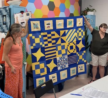 The Jersey Shore MQG has a strong emphasis on community outreach, including the worldwide community. Recently I learned of a German quilt shop owner who is collecting quilt blocks to assemble and distribute to Ukrainian children who’ve been displaced and now living in her country. I asked our members if anyone would like to join me in making a block. True to form, the response was fantastic and as a result I was able to put together the first quilt and a member, MaryJane donated the second one. Both are now enroute to Germany and will sure to brighten the day of a child. This is why we quilt!!