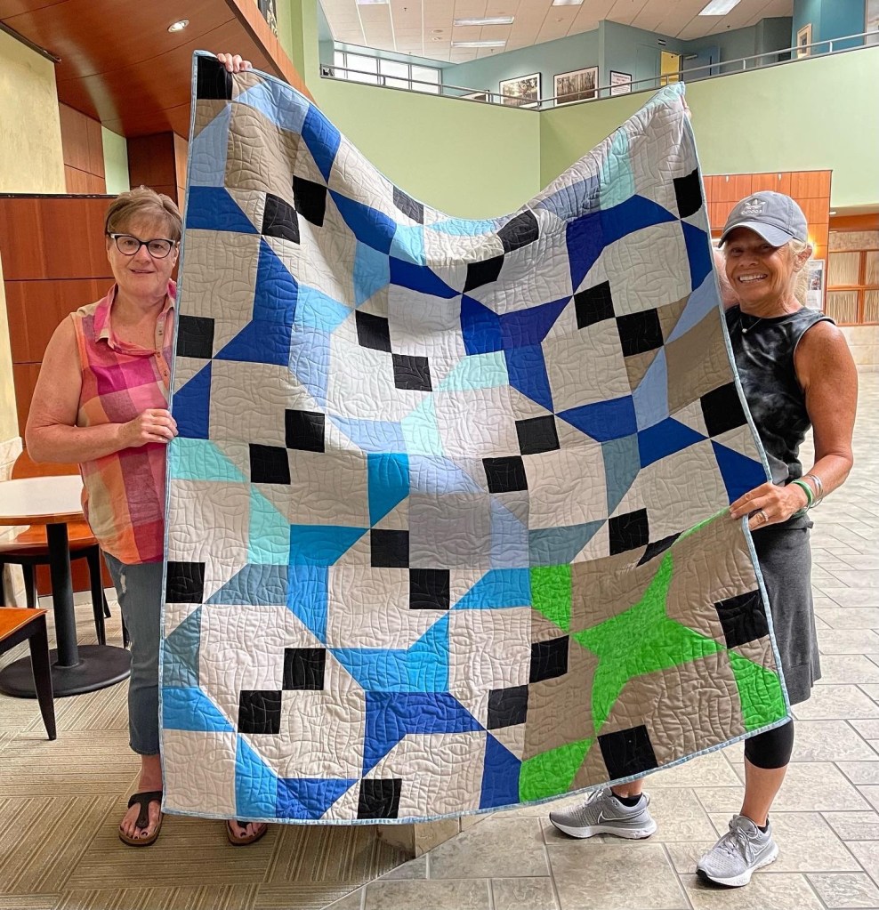 Team Shamrock, headed by Kathy Cunningham in honor of her brother who lost his life on 9/11, is a top fundraiser for Tunnel to Towers. The Jersey Shore MQG supports Team Shamrock by providing quilts for local smart home recipients and for their fundraising events. Their most recent fundraiser was held on July 14th at Bar Anticipation in Lake Como NJ. That event raised $40,000 for Tunnel To Towers and we were proud to have created this quilt as part of the fundraiser. Our members were asked to contribute a “one for me one for charity” as part of our monthly block lotto project. We were able to assemble the blocks we received into this phenomenal modern quilt with its “nod” to Team Shamrock ☘️ in the lower right corner. Kathy is always wowed by our work and never misses an opportunity to shout us out whether it’s to a class she’s teaching at the Atlantic Club or to everyone gathered at a fundraiser and we are just as grateful to her for that, as she is to us for the support we give her.