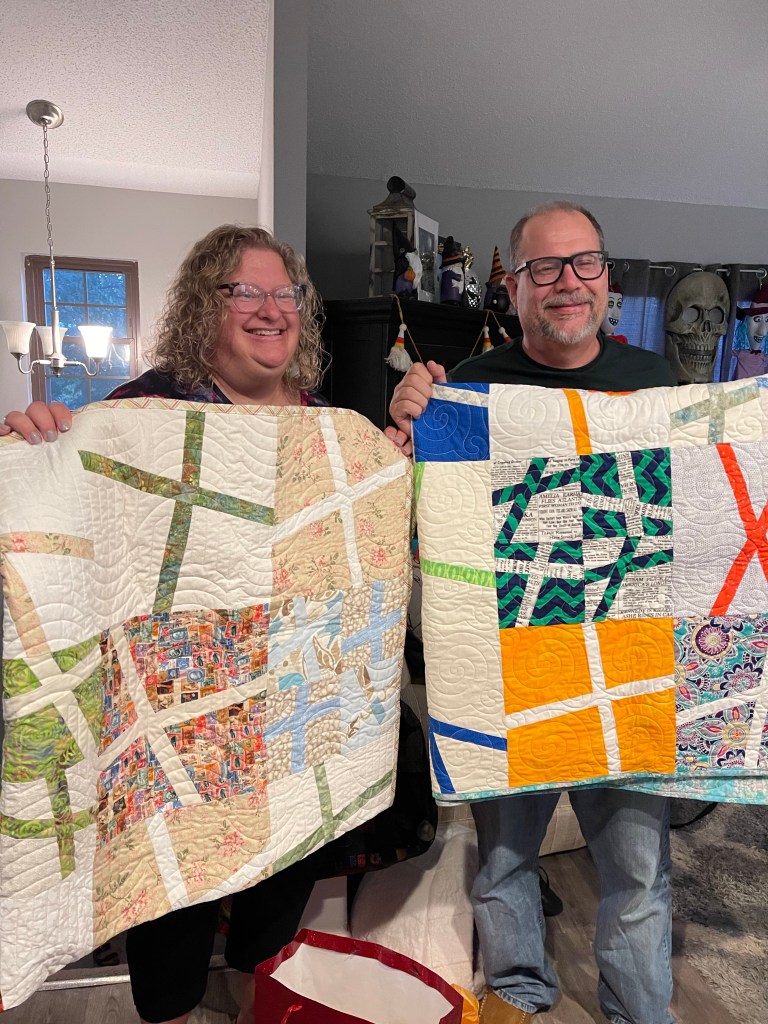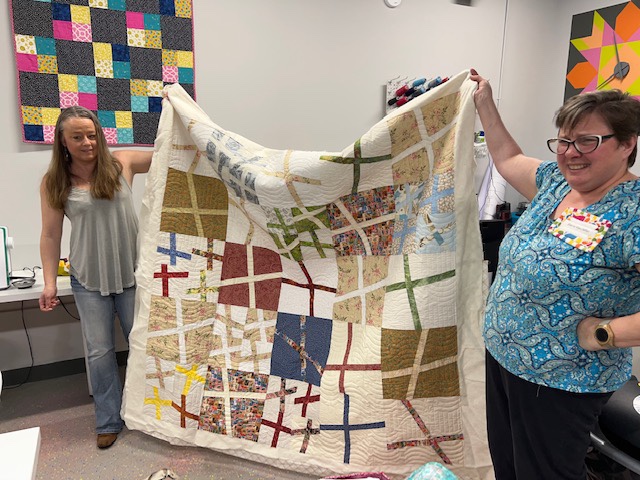 Not long ago, Brandy told us about a family in Jackson who had lost their home and pets in a fire. She asked us if we’d like to help her make them a quilt. JSMQG members are always at the ready to help so when Brandy asked for a couple of Wonky Cross blocks to construct a quilt for this family it will come as no surprise that she received so many she was able to assemble two quilts! Sherre donated her longarming services and quilted these up.