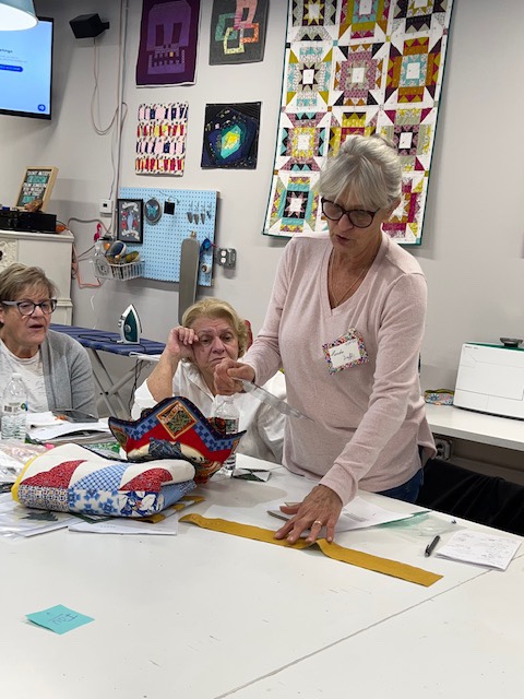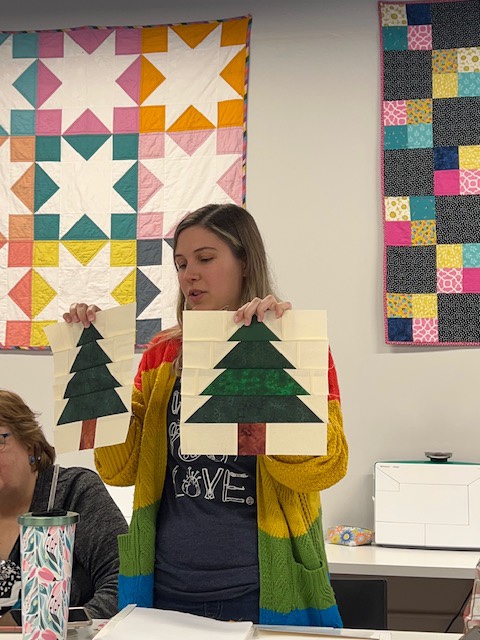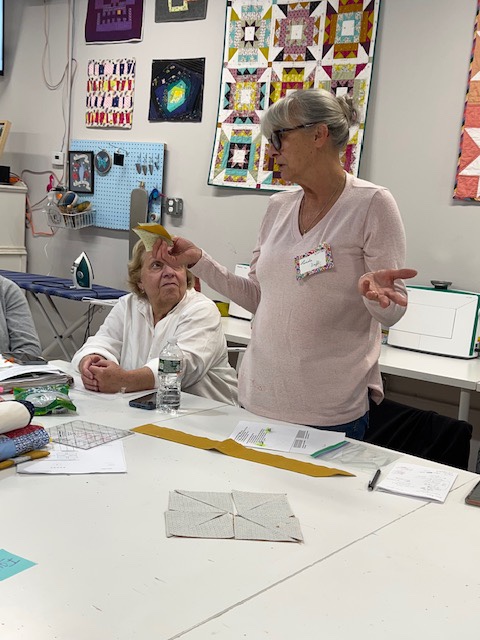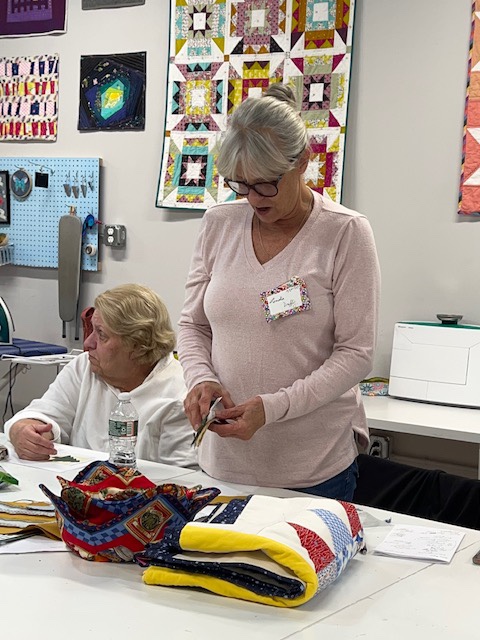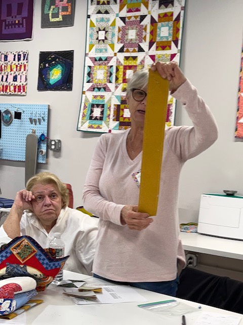 Part of every meeting is our Program segment. These are member led and have proven to be both educational and very well received. This month Linda Duffy demonstrated several methods for making multiple half square triangles. Whether you’re new to this craft or have been at it for years, there is always something to learn Sewing strips together to produce half square triangles was new to me! Linda is also a firm believer in starching fabric prior to cutting for precision cutting and piecing and she touched on that in her tutorial, but has promised to devote an entire Program to starching, different types and even mixing your own next year. Thanks Linda
