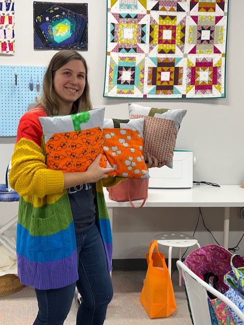 November in New Jersey is typically all about crisp weather and an explosion of Fall colors, we’ve had the colors but not much chill in the air. It’s coming though! Members made chevron blocks in Fall themed colors for our block lotto drawing and wowza they looked awesome. Congratulations to new member, Katie who won these. We cannot wait to see this as an awesome quilt!
