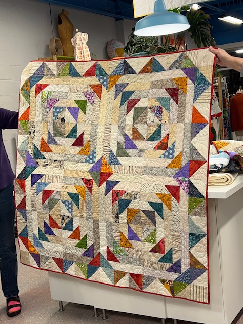 MaryJane has been at it again, using the same fabric she managed to make three quilts and a pieced back, so really four quilts. And always with a story!! That’s what we love about her!!!