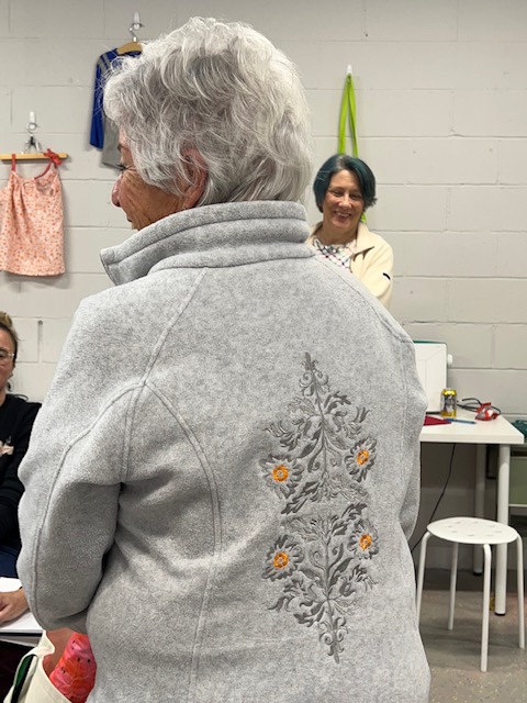Last month our Program was about unusual machine feet led by June Mellinger. At that time June, who had a 25 year career at Brother Sewing Machine, offered a foot of the month for us. So this month she schooled us about the benefits of a binding foot. Very interesting. While she was demonstrating that someone noticed the embroidery on the back of her jacket. According to Junes husband, no surface is untouched by June’s machine embroidery. All of her quilts are quilted using her Brother machine embroidery function.
