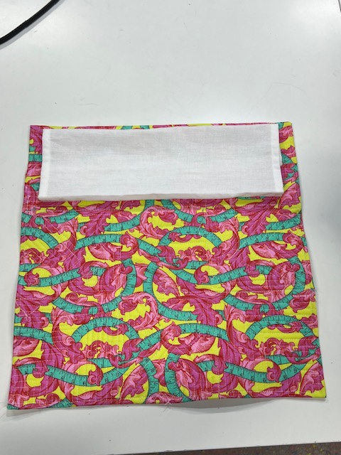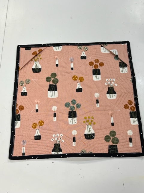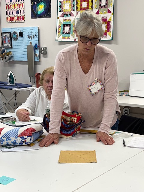 Lastly, in preparation for the upcoming exhibit, Eileen prepared two different methods for hanging a quilt. A hanging sleeve for the back of a larger quilt and corner pockets to hang minis along with a handout of instructions.