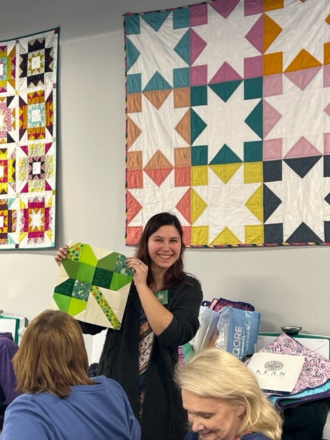 You’ll never guess what we’re making for March?! Scrappy shamrocks on an off white background. Each of us will contribute two blocks, one for the winning member and one for us to make a quilt for Team Shamrock (Tunnel to Towers) August fundraiser at Bar Anticipation in Lake Como. Kathy Cunningham is gonna love this one!